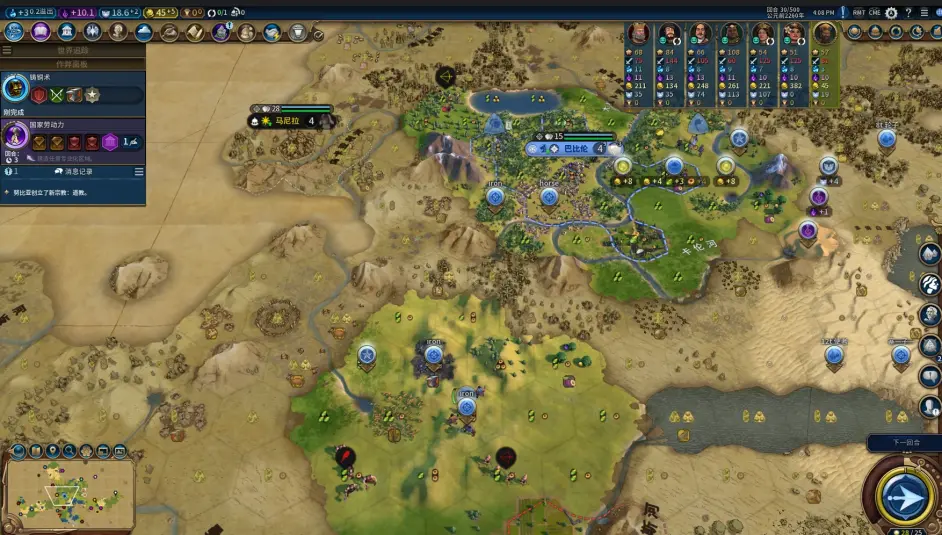 - 首都上8人口後增長乏力,開徭役錘宙斯像;海城商業錘成,瑞納點出2點,雖然有1點總督餘量可以點出瑞納3,但此時外商產出很低,尚不到發力期,而且落地的五個城任務都非常重,沒有富餘的國力出商線;考慮完畢後,決定海城用瑞納2的區域位出學院觸發下科舉制的鼓舞。