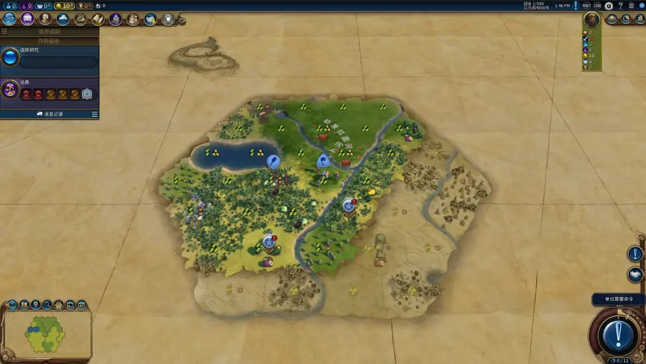 30t解鎖鑄銅,左下角根據刷的鐵確認鐵城的位置,一分準備落到右下的李子處,貼多佛白崖落第二個聖地。工人回頭準備砍首都商業地圖示下的樹加速下商業的節奏;