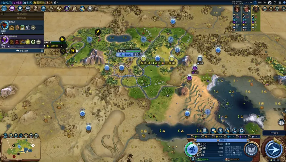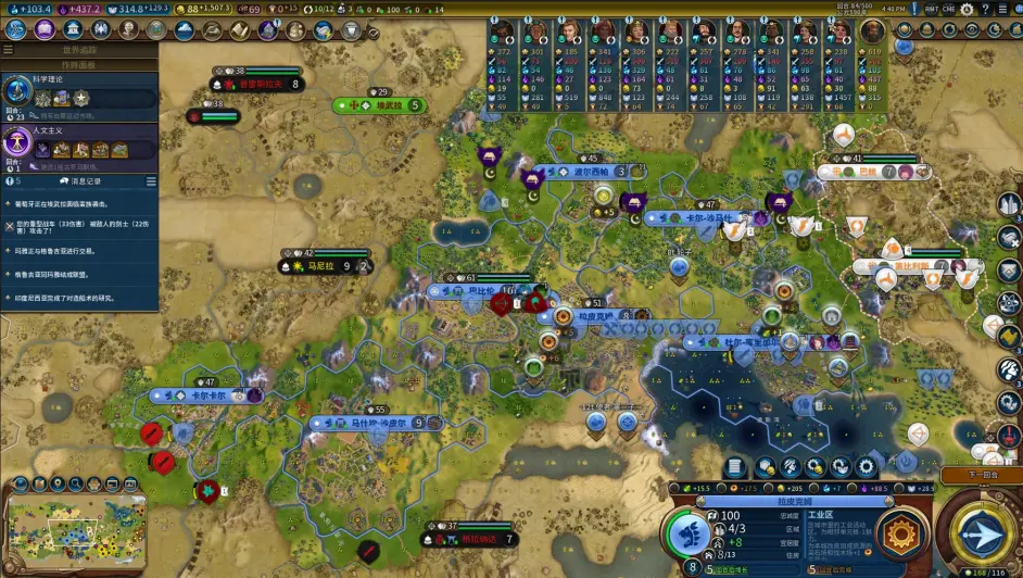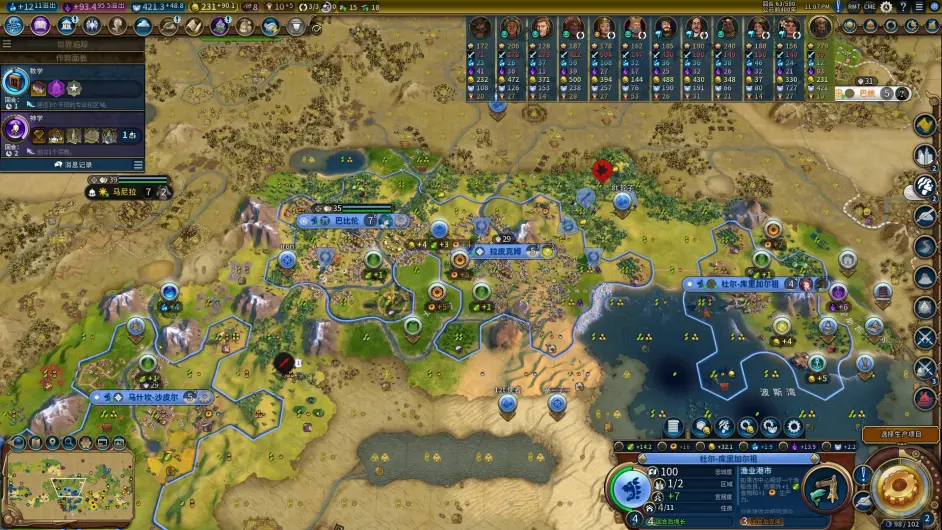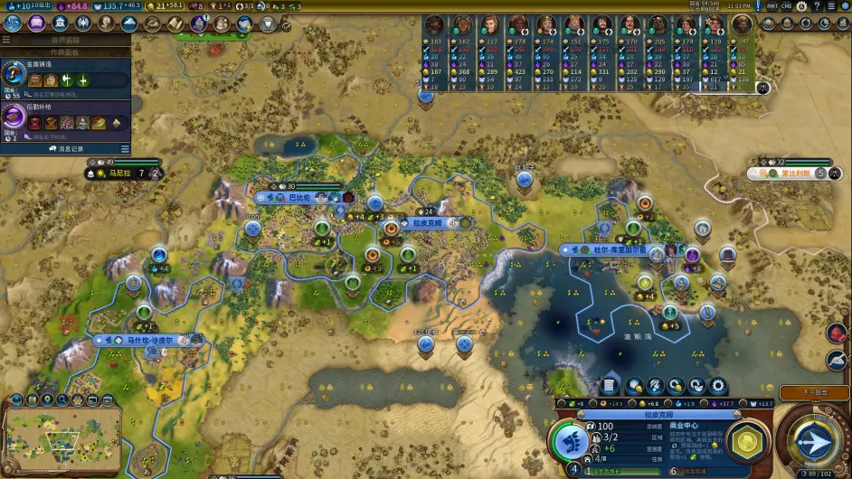 老馬迴歸剛剛漲到7人口的一分城,落下港口解鎖製圖學任務第二波節奏就是榮神益人和博洛尼亞的combo了,巴比倫的能力本就使早期出建築的價效比極高,馬2環遊有讓我們更早的錘出了區域,而且這把城市區域規劃不錯,鐵城的大量戰略以及首都和一分的兩個高相鄰加成商業提供了大量的啟動金幣給我們買出商業建築和工業建築,買下建築後吃到博洛尼亞加成繼續加速拿偉人,拿到偉人時又觸發榮神益人信條拿到遺物,賣掉又能拿到金幣買區域和移民,攢下的金幣也給我們啟動瑞納城提供了初始資本。