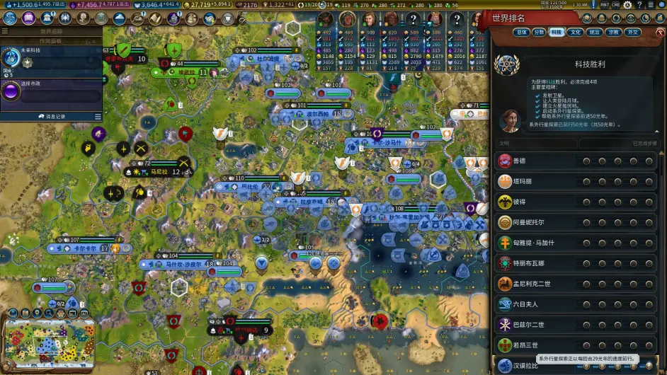 進入尾盤,首先需要規劃的就是11個無ylk的任務(火箭、核聚變、遠端通訊、隱形技術和7個未來科技);阿雷西博天文臺 + 牛津大學可以完成7個,火箭我們選擇強衝,剩下3個就需要靠AI拿大科觸發大圖效果來解決了,其中伽利略已經卡在了超雙時代懲罰上,拿掉後正好能觸發核聚變 + 遠端通訊 + 隱形術的ylk;這把不需要再跑專案拿大科了; 在這裡也可以看到,提升科技節奏其實非常簡單,強拿伽利略吃到1K ~ 1.5K科技,就可以加速火箭3t~4t左右,再補一些學院建築還能快1t ~ 2t左右,極限的話100t就能拿到火箭,但沒有民主政體買宇航中心的效果,早解鎖火箭也白搭,因此在這張圖比較完美的條件下,在93t文化已經破1K,文化仍然是飛天瓶頸。因此只要出少量學院建築,保證火箭和民主政體對齊即可。