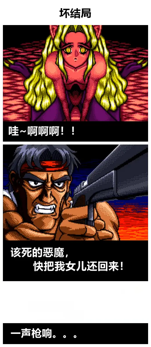 如果前四關融合同樣顏色的水晶後,主角惡魔形態不會改變,但惡魔威力會變得越來越強大,但破關後遊戲會進入壞結局。