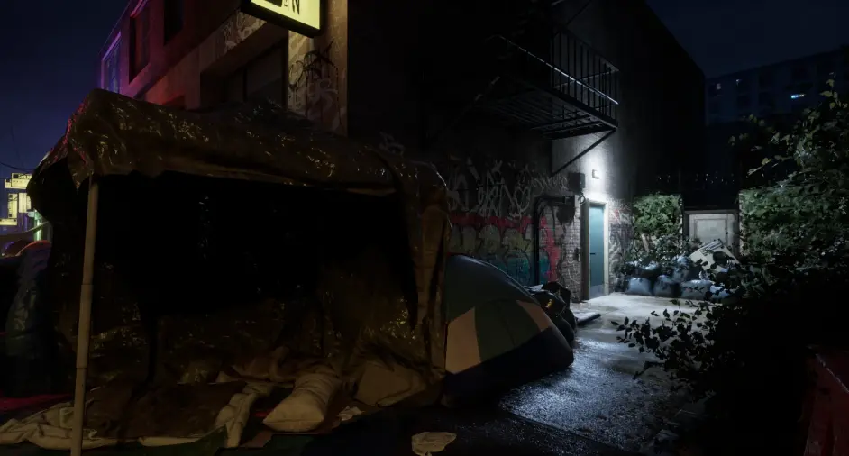 新版車庫:通過更多細節體現場景人物的活動。新版本中,這一特點也會出現在地圖其他部分我們想讓遊戲內的一切元素都更貼近現實,所以地圖的各個角落會包含更多背景資訊。這些細節則讓該關卡,Los Suenos市的設定更加豐富。城市的破敗一面變得愈發常見,販賣人口的犯罪行為也更加猖獗。