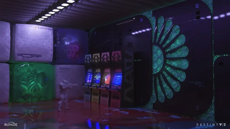 而到了內歐姆那,似乎一切變得陌生起來。處處閃爍著霓虹燈,地面和建築由大面積五顏六色的色塊構成,如果不是煩人的Vex和暗影軍團,我甚至會以為內歐姆那的某些部分是卡通渲染而成。而其中穿插的內歐姆那新聞和寧博思不合時宜的玩笑,讓內歐姆那顯得與命運系列一直以來風格和畫風徹底不同。