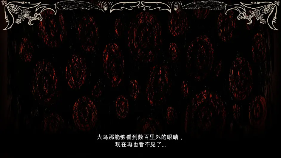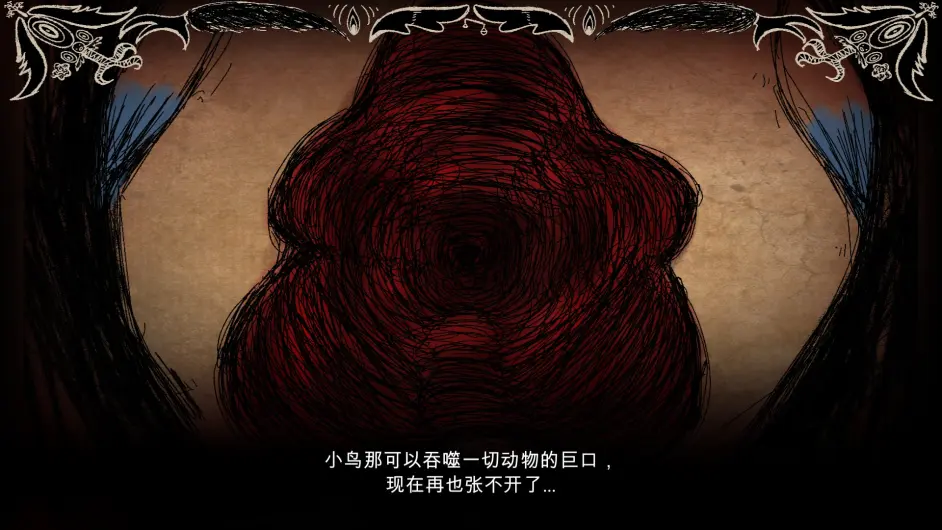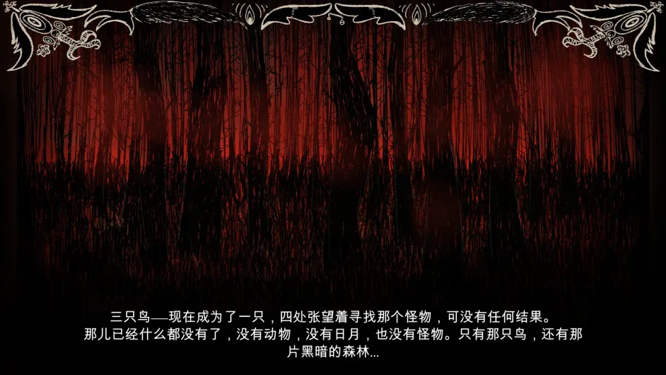 三隻鳥————現在成為了一隻,四處張望著尋找那個怪物,可沒有任何結果。那兒已經什麼都沒有了,沒有動物,沒有日月,也沒有怪物。只有那隻鳥,還有那片黑暗的森林...