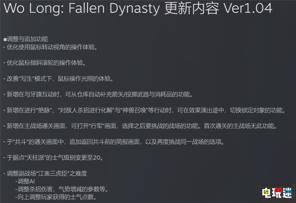 光榮特庫摩正式推出《臥龍 蒼天隕落》1.04更新補丁,新版本為遊戲增加了自動補充箭矢等新功能,繼續優化PC操縱,而最重要的則是下調了“江東三基佬”任務江表三虎臣的難度。