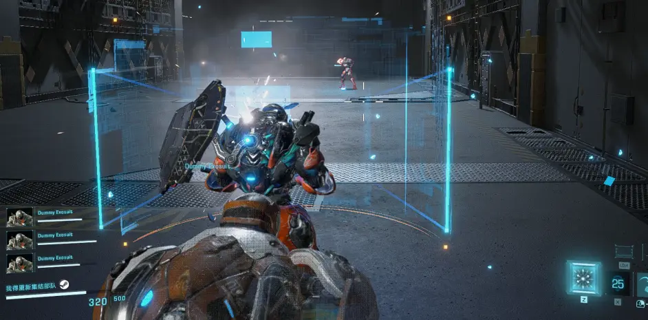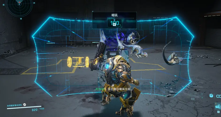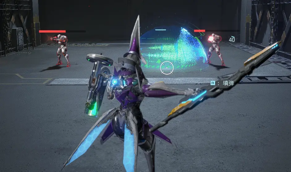 在玩家正前方,部署一個跟隨玩家移動的能量防護盾,護盾沒有血量上限可以格擋所有投射物傷害。