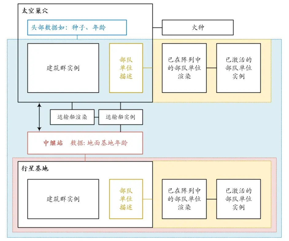 而為了保持一定的確定性,我重新翻版了巢穴生長過程的設計,使其在不受干擾的情況下,根據確定的年齡和隨機數種子可以實時烘焙出一個確定的巢穴生長版圖。這樣的話,即使每個巢穴包含多達2000個建築和單位,我們至少能將遠處未相遇的巢穴轉化為“年齡”、“隨機數種子”等若干頭部資料。同時仍然生成中繼站和火種,以確保未相遇的黑霧仍然可以向外擴張。
