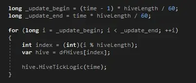 (黑霧的擴張邏輯)經過考慮後,我們將黑霧巢穴的更新邏輯設定為每60邏輯幀更新一次,此外,所有巢穴的更新儘量平均的分佈在每一幀,避免大量邏輯集中在一幀內更新。例如玩家選擇了60個恆星的開局,那每一邏輯幀將輪流更新一個行星系的黑霧巢穴。以下是簡單的負載均衡程式碼: