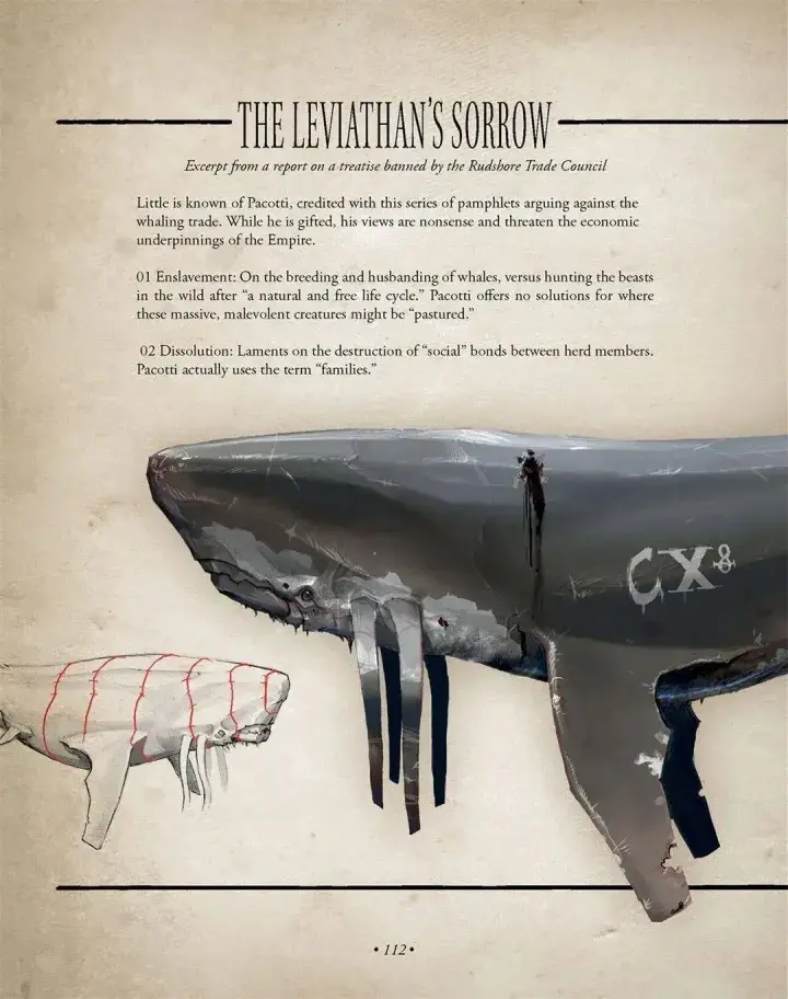 鯨魚被剖開肚子,人物為羅斯博爾鯨油(Whale oil)起初是被鯨魚屠宰廠外(羅斯韋德屠宰廠街)的流浪漢收集並用來點火,這一幕呢剛好被自然科學家埃斯蒙德·羅斯博爾(Esmond Roseburrow)看到,通過特殊的提煉過程,他把鯨油變成了推動帝國科技百年曆史的燃料,成為頓沃工業革命的能源基石。