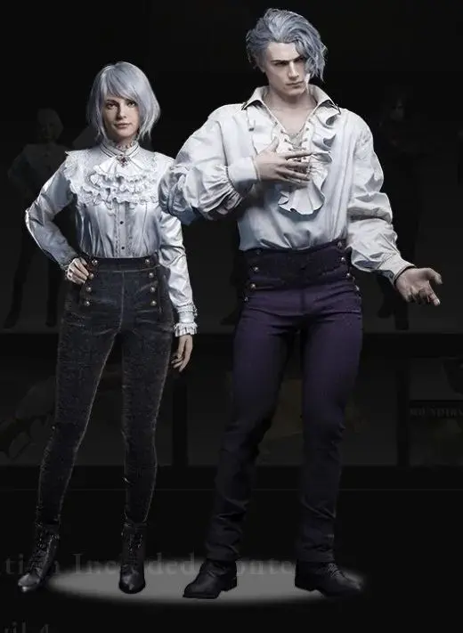 其他服裝部分,還有“浪漫風”的套裝,可以看到里昂和艾希莉都染上銀白髮,搭配略帶惡魔城風格的古裝。其他還有里昂的英雄騎士服裝和刺客感的黑色服裝等等,並有幾款豪華版限定的武器、道具和濾鏡。
