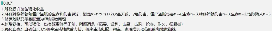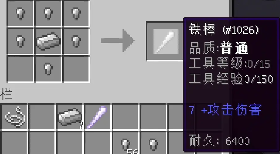 極難版0.0.7的時候新增的鐵棒,一樣可以鍛造加傷害,並且攻擊距離等於劍。擊暈和擊退是戰錘的附魔,棒子是和戰錘相同型別的鈍型武器,所以也有。征服者則是每一級增加漸進傷害的,沒有什麼用,用得到的地方還不讓用(指殭屍BOSS免疫“暴擊”和“征服者”附魔效果)