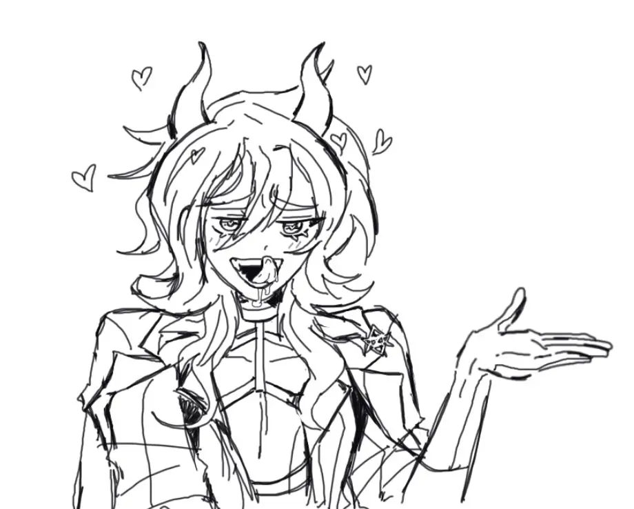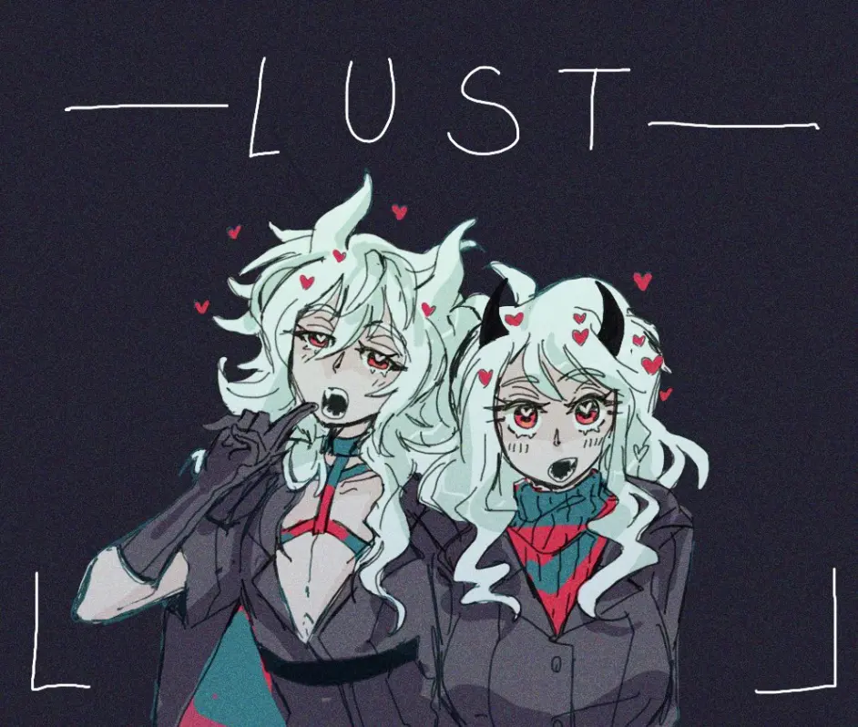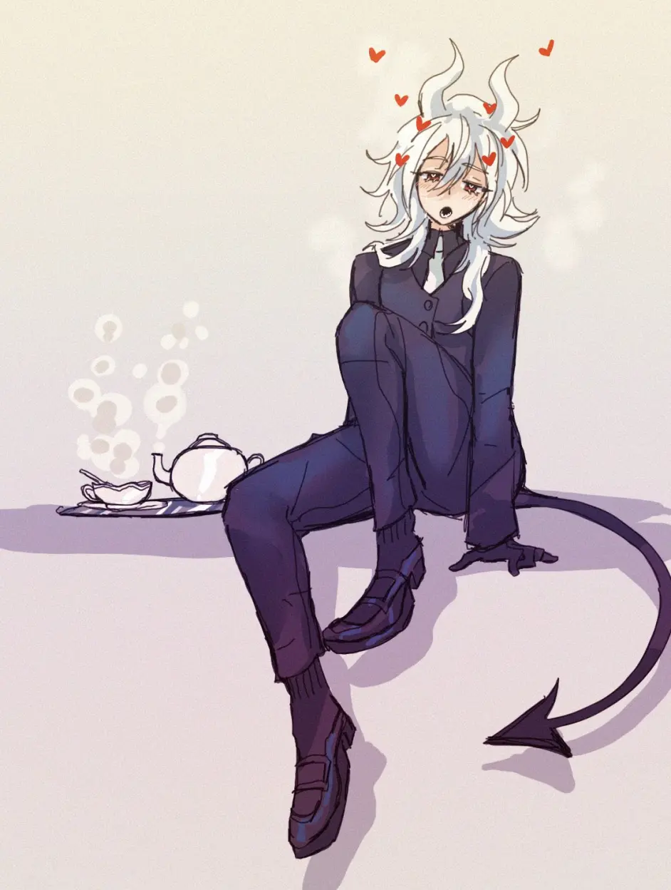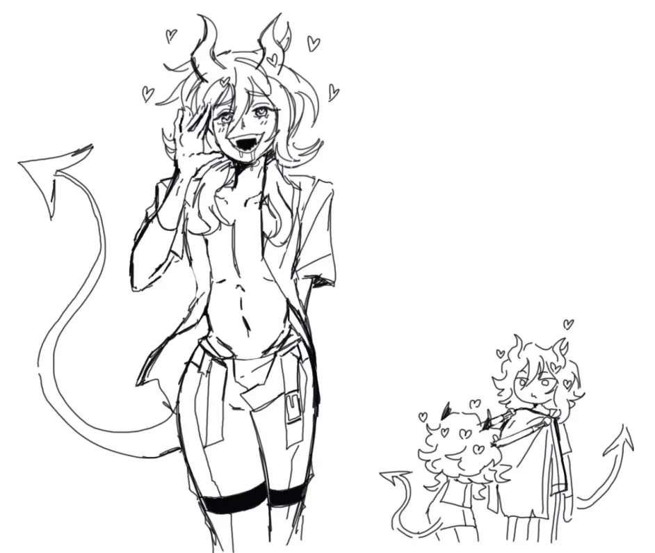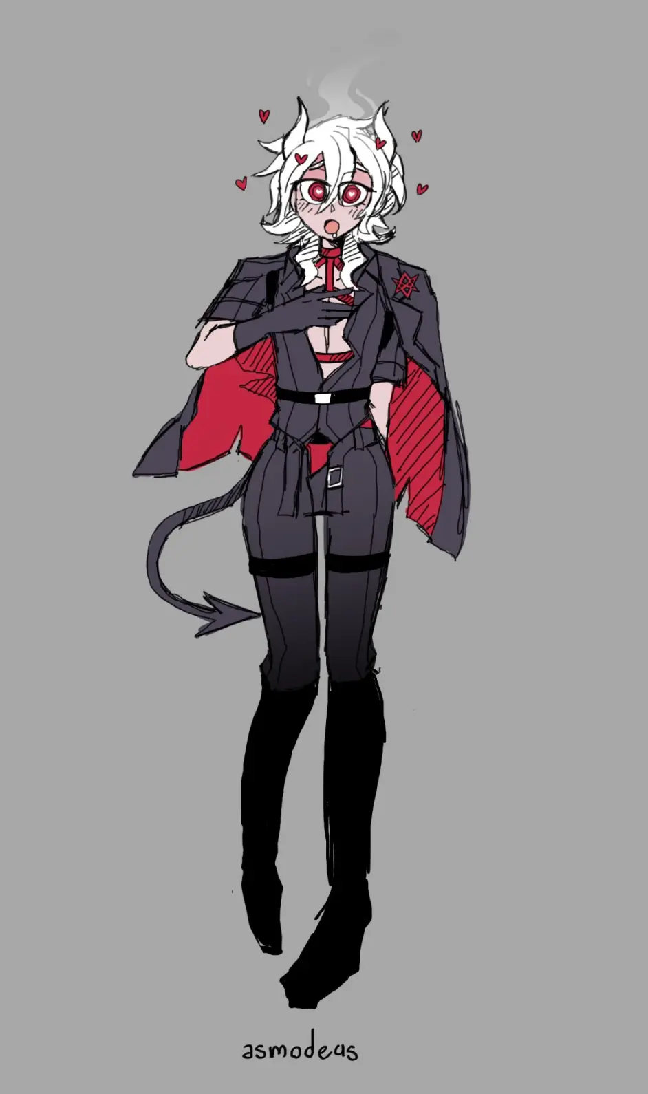 作者:因為我把阿斯蒙蒂斯(Asmodeus)設定成莫迪烏斯(Modeus)的哥哥,所以我想讓他的頭髮和莫迪烏斯相似。他的衣服上有“一筆六芒星(Unicursal Hexagram)”徽章。因為他的身份是地獄七魔王之一,所以他的角和路西法、別西卜一樣是白色。因為他是代表慾望(Lust)的惡魔,所以在他的襯衫、外套、褲子的扣子都不扣上,在襯衫下面穿著綁帶,他不太喜歡穿著外套。他還有四條綁帶,一對在大腿上,一對在肩膀上。