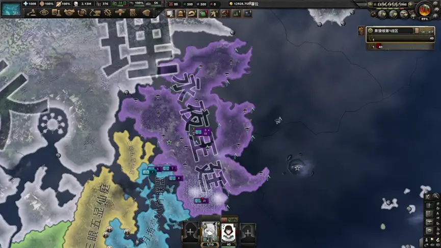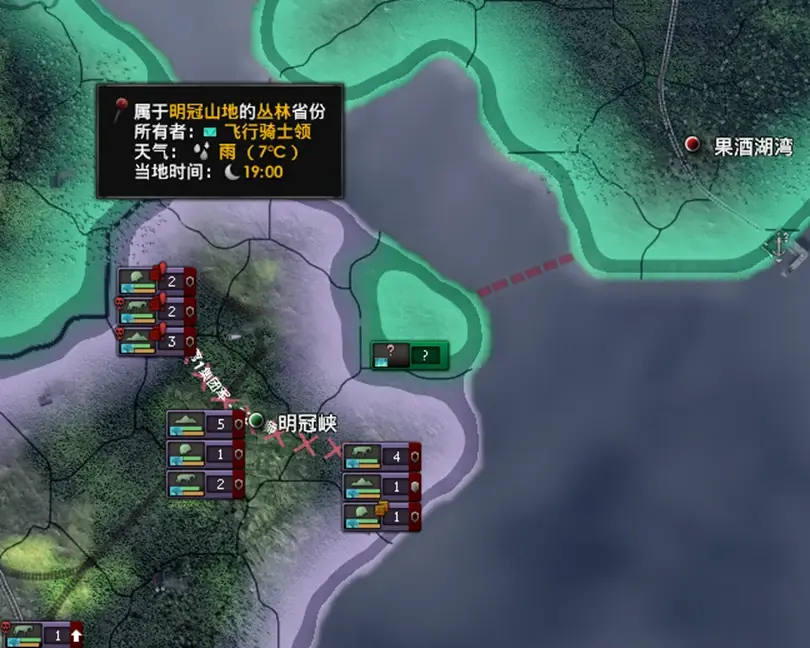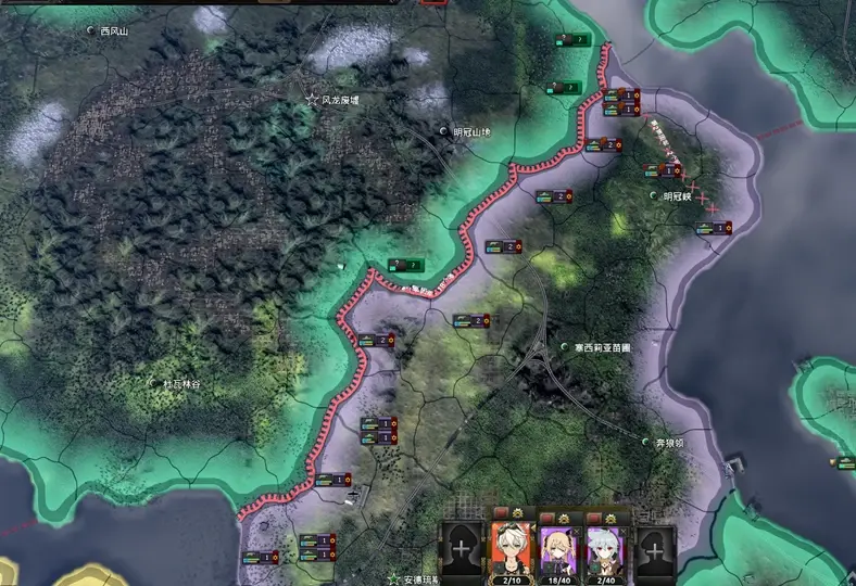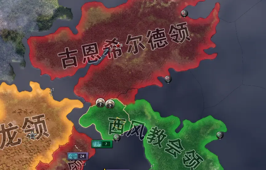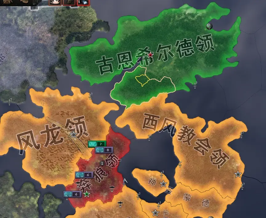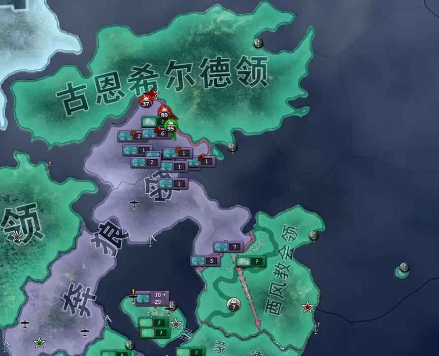 遭到騎士團和迪盧克同時宣戰,將之前拿下的教會和古恩希爾德領地盤全部讓出去作緩衝,放五個師守住海峽,點為了身後的家園——於鬥爭中求意義。