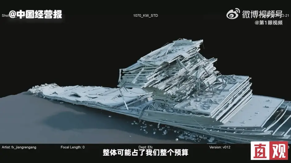 其中,“古箏行動”作為高燃場面,佔據特效總預近1/4的量級。“但它在總時長上可遠遠不到這個比例,整個片子的動畫片、特效以及科學解釋共計四百多分鐘,古箏行動只有二十多分鐘,所以它的單位時間資源使用是最高的。”
