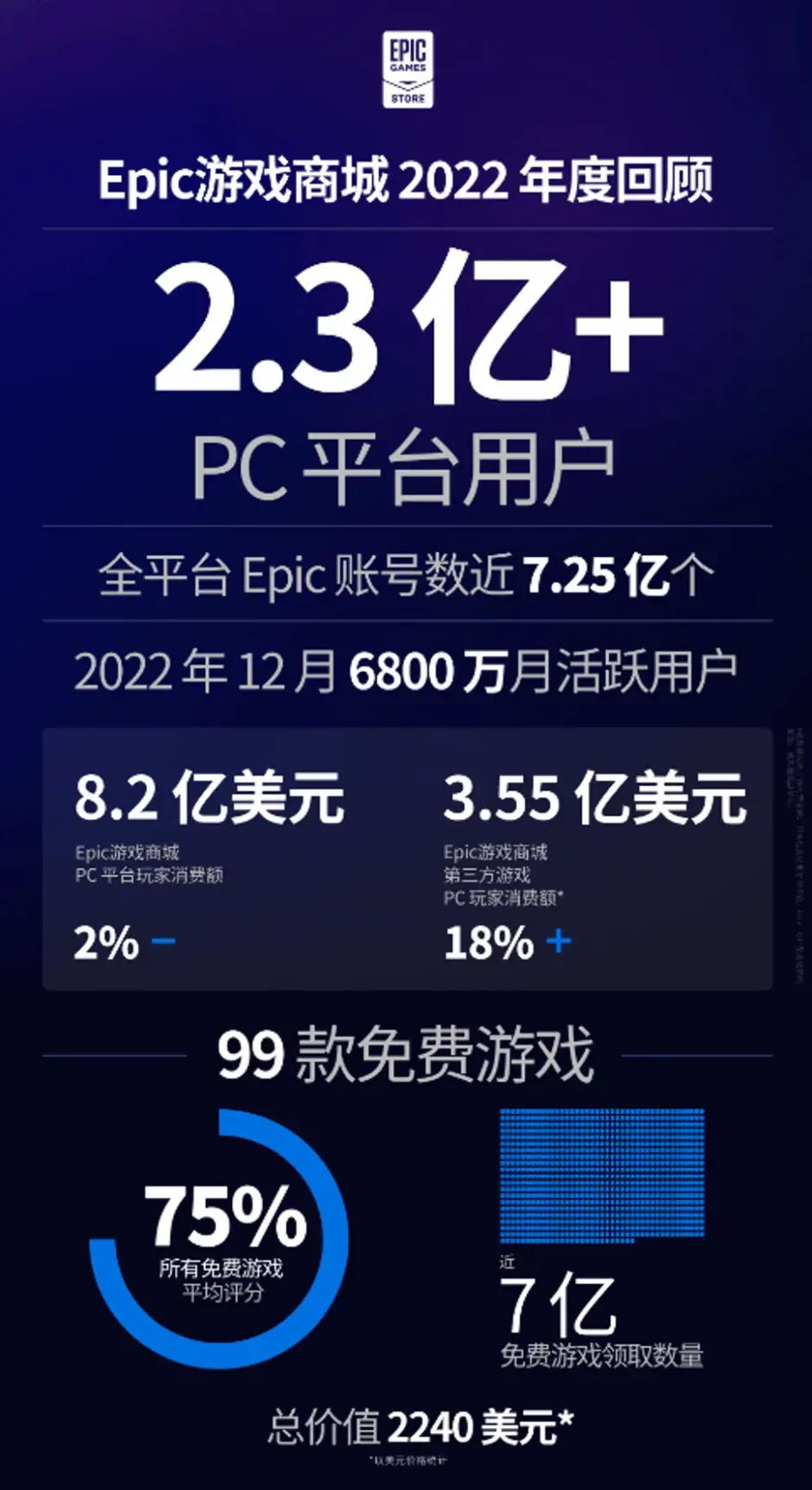 Epic 2022年度總結:PC使用者超2.3億!送出99款遊戲今日,Epic商城釋出2022年度回顧,宣佈Epic遊戲商城現有超過2.3億PC使用者,相比2022年增長了3600萬。跨平臺賬戶數量達到了7.23億。
