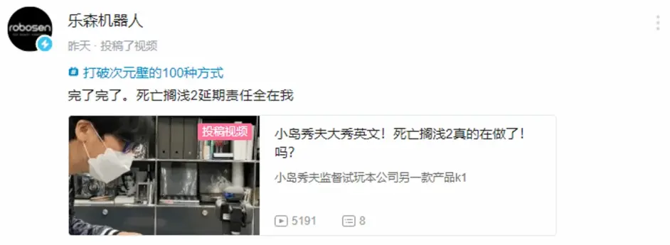 小島秀夫“沉迷”機器人 樂森官方:完了!《死亡擱淺2》延期我全責近日,樂森機器人B站官方賬號分享了知名遊戲製作人小島秀夫“沉迷”自己機器人產品的視訊,一起來看看吧!