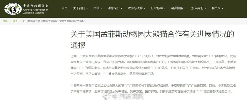 中國動物園協會稱,中美雙方一直在積極商洽加快辦理大熊貓丫丫回國相關手續的方式和途徑,爭取早日將丫丫接返回國。