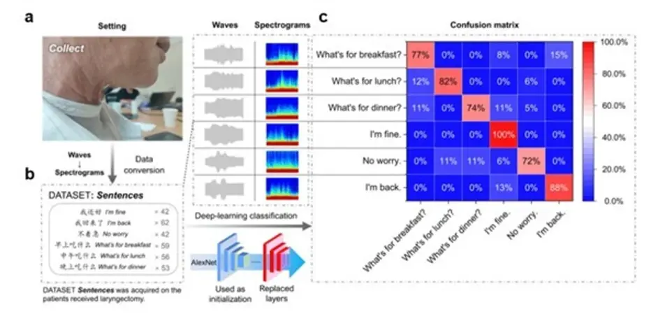 近日,清華大學積體電路學院教授任天令團隊研發了一款可穿戴人工喉,可以識別喉部發聲的訊號,並將其轉換為語音播放,還原準確率超90%。該成果已發表在《自然》人工智慧子刊《自然·機器智慧》上。