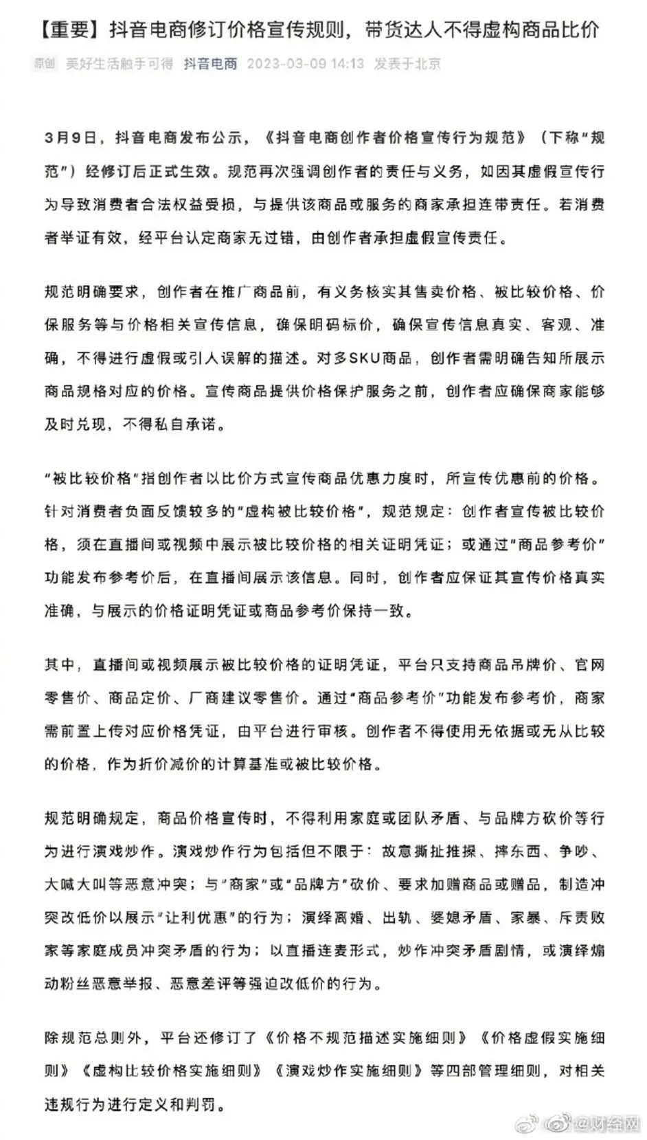 然而類似的套路其實在直播帶貨中屢見不鮮。今日,抖音電商釋出公示,《抖音電商創作者價格宣傳行為規範》經修訂後正式生效。