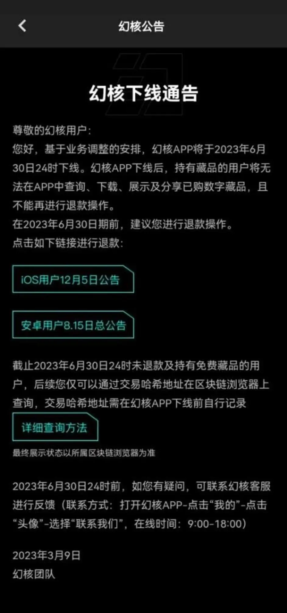 幻核APP下線後,持有藏品的使用者將無法在APP中查詢、下載、展示及分享已購數字藏品,且不能再進行退款操作。建議使用者在2023年6月30日前進行退款操作。