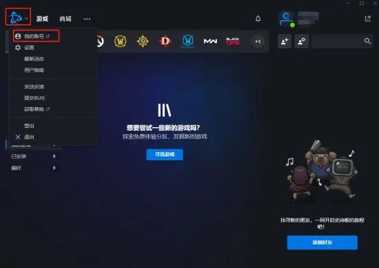 二、進入暴雪戰網客戶端後點選左上角暴雪圖示,在彈出的小視窗裡找到並點選【我的賬號】