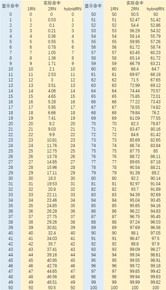 當顯示命中≤50時,實際命中=顯示命中;當顯示命中>50時,實際命中=[(顯示命中 × 100) + (40 / 3) × 顯示命中 × sin((0.02(顯示命中) − 1) × 180)]向下取整/100,其中sin函式採用角度制。