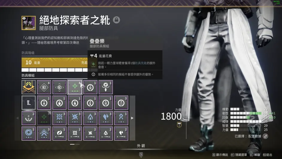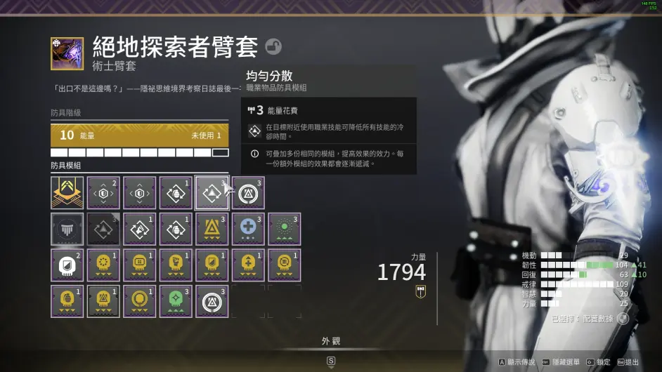 頭部模組為產球、手雷回超能與釋放職業技能回超能,為啥腰帶職業技能回超能到臂環再說。手部為核心手雷擊殺產光球與手雷快速啟動,就相當於是火力無限模組的替代品了。胸部為備彈模組與防具充能+1,這樣吃兩個球剛好四層滿,不會出現浪費。腿部為層層不絕與拾取光球恢復職業能量,幫助技能迴轉。臂環為炸彈客、均勻分散與收割者,收割者穩定的產光球效果非常好用,順利的啟動吞食與護甲充能,由於術士的職業技能cd較長所以可以最大化均勻分散與養精蓄銳的效果,釋放一次差不多可以恢復一小格的三分之一了,速轉大招非常誇張。