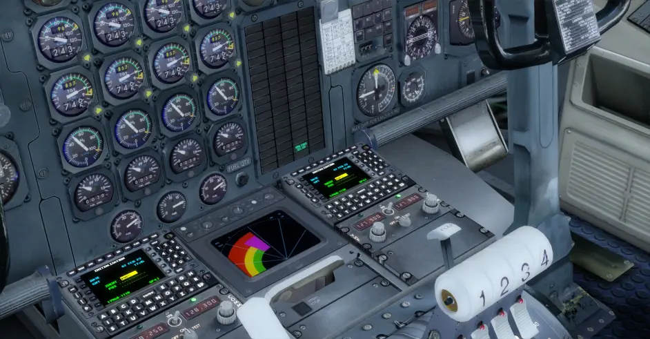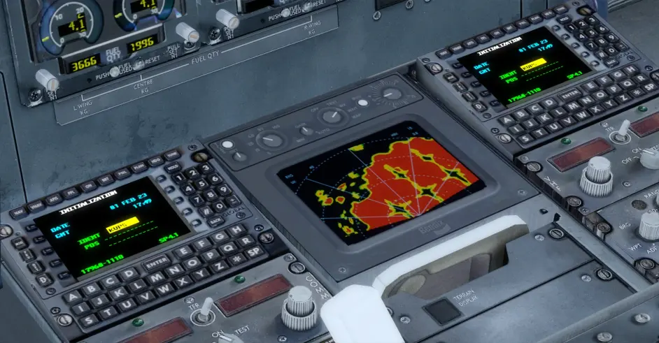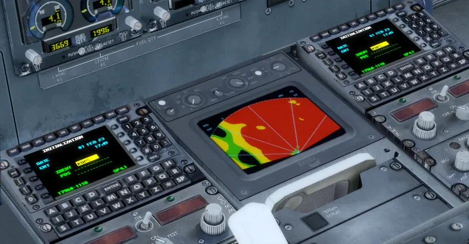 作為一款最早起源於FS9時代已經有10年多歷史的機模,在十多年前那個網際網路沒有如此發達的時代,依據實時天氣的複雜天氣條件下的模擬飛行基本上是不可能的,所以早些年很多外掛都沒有氣象雷達,但是如今在ASP3D這種天氣外掛的加成下,沒有氣象雷達在白天可能還好,晚上就太致命了,根據QW的建模中氣象雷達位置貼圖的模樣,目測Milviz的氣象雷達面板最為接近,都是班迪克斯氣象雷達,所以整合了個REX/Milviz的Weather Radar進去。