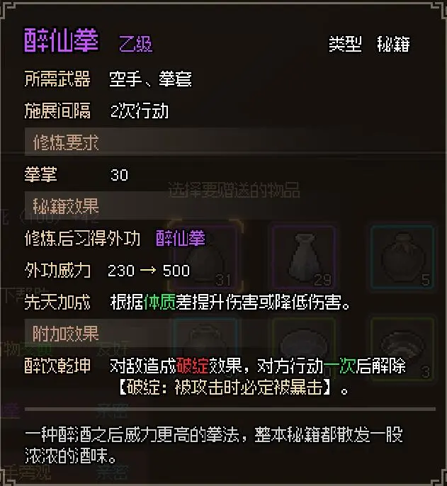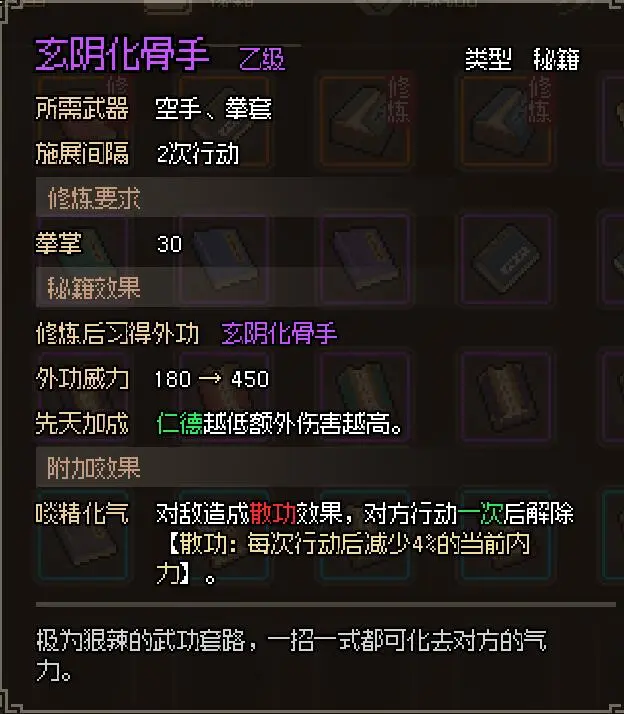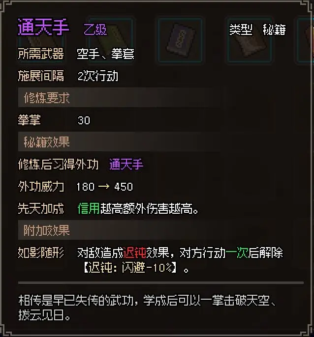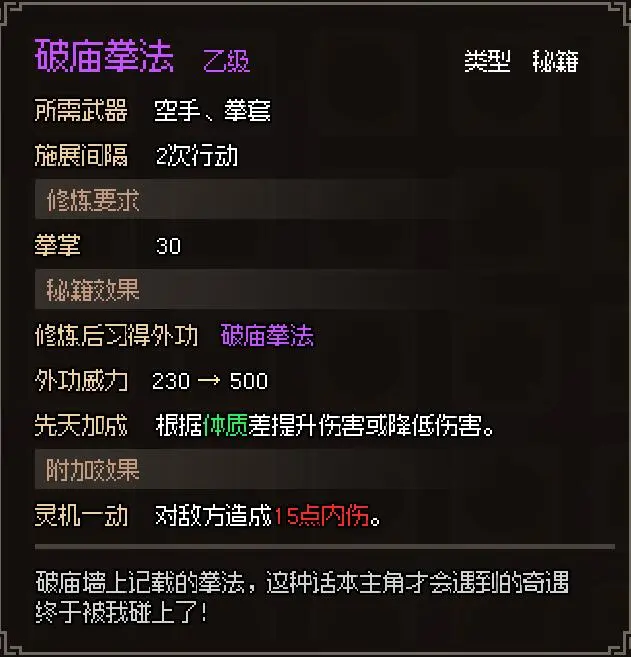 1、無名小村對話包打聽,得知夜間破廟牆上顯示文字的傳聞2、夜間前往破廟,即可觸發學習劇情獲得(角色拳法數值≥30點)