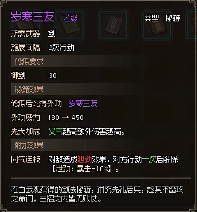 1、襄樊地區加入道玄宗,通過劇情事件被門派關禁閉後,在洞內牆壁上自行悟道獲得(需要角色“即時”悟性為1點)PS:角色被門派關禁閉劇情事件的觸發條件有兩種:①通過潛行引開摘星閣的守衛以後,強行闖入樓內,會觸發劇情戰鬥,被打敗後關禁閉10天②在外面把仁德降到-10以後,再次進入道玄宗,會觸發劇情關禁閉3天