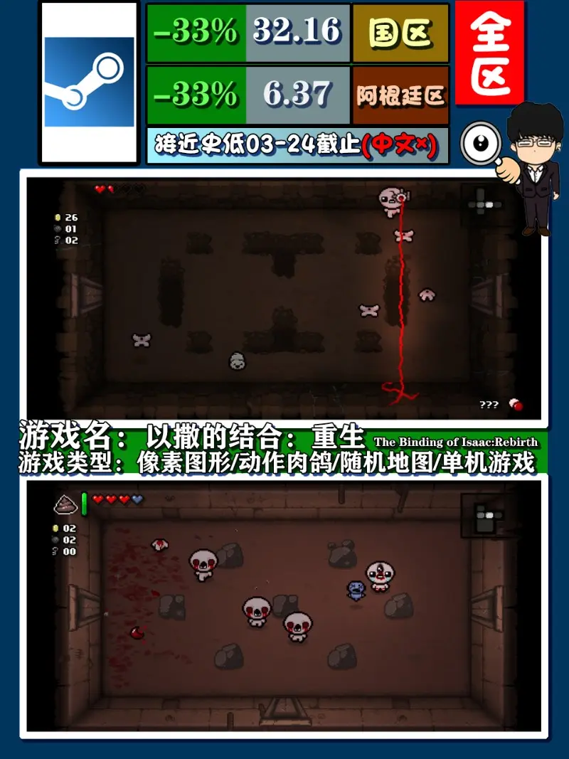 《以撒的結合:重生》,可以說這是款肉鴿鼻祖遊戲之一,想必也是眾多肉鴿愛好者的啟蒙遊戲,作為一款多年依舊steam平臺無官中的遊戲,卻熱度依舊未減,它在肉鴿遊戲中的隨機性上做的非常極致,所以不斷重複的遊玩也不會讓人感覺到有疲勞感,不過從畫面上來說,雖然是畫素圖形,但多少還是略帶血腥,這方面有反感的玩家們還望謹慎選擇