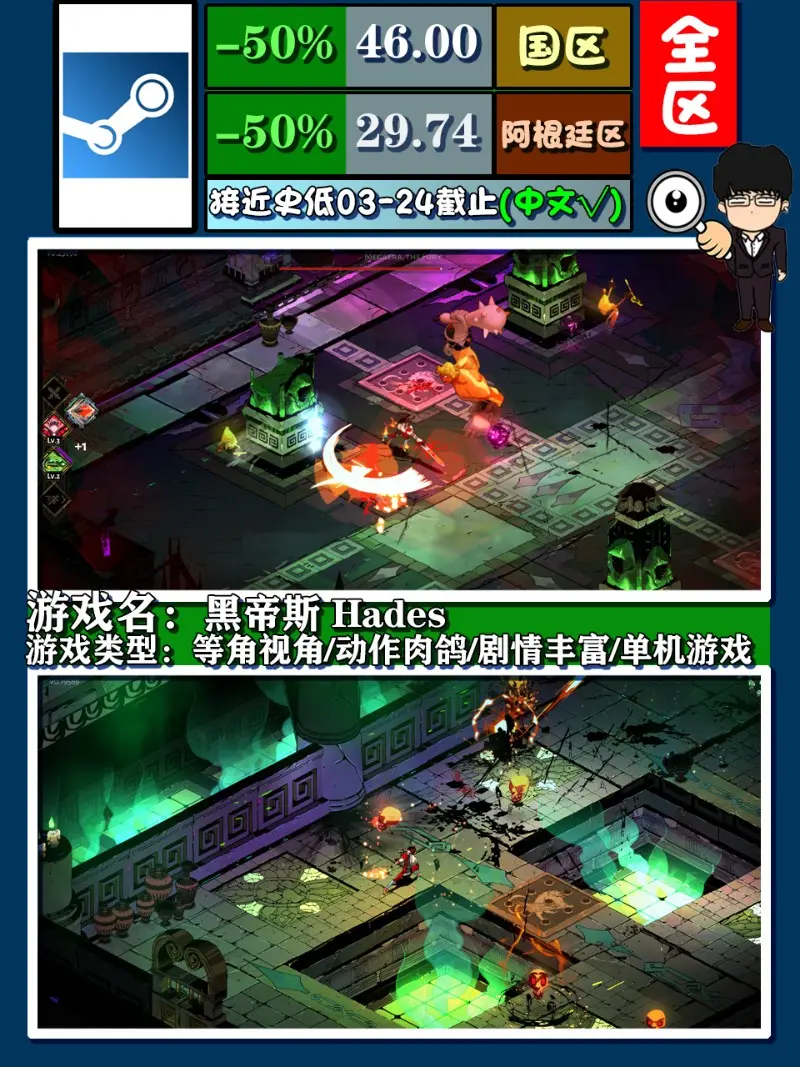 《黑帝斯》,也叫《哈迪斯》,雖說此次並非史低,但也阻止不了老基德向大家推薦,價位方面只差6元,如今6塊錢買杯奶茶多放點料都不夠,更何況是這麼優秀的遊戲呢,玩過的自然不多說,無論畫面效果,文字對白,還是眾多動作遊戲玩家們非常在意的打擊感,在這款遊戲下都是選擇入手的理由,另外新作也會於不久的未來與大家見面,不妨先玩初代瞭解先