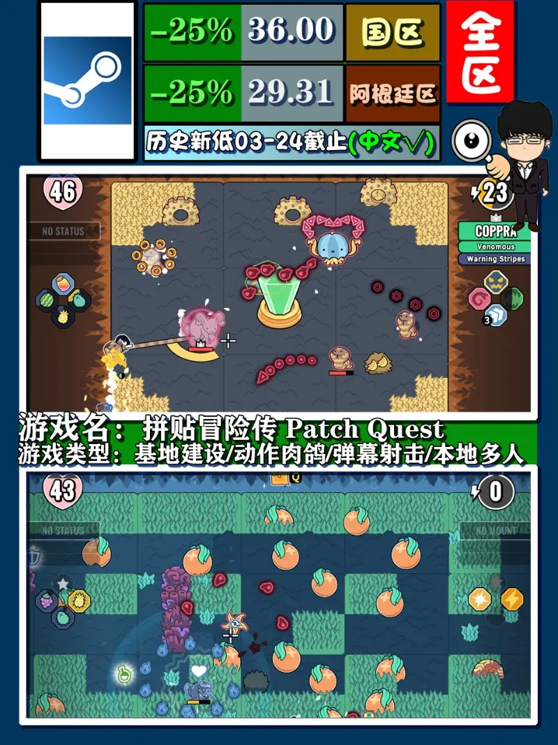 《拼貼冒險傳》,一款單人開發遊戲,畫面非常討喜,對於單純喜歡肉鴿遊戲的玩家,或許喜歡多型別的玩家們更為合適,除了肉鴿,彈幕射擊,還有寵物收集,建造營地,加上又是今年新出遊戲,想必現階段的更新也會是很高頻率,價位也算美麗,入手真心可以