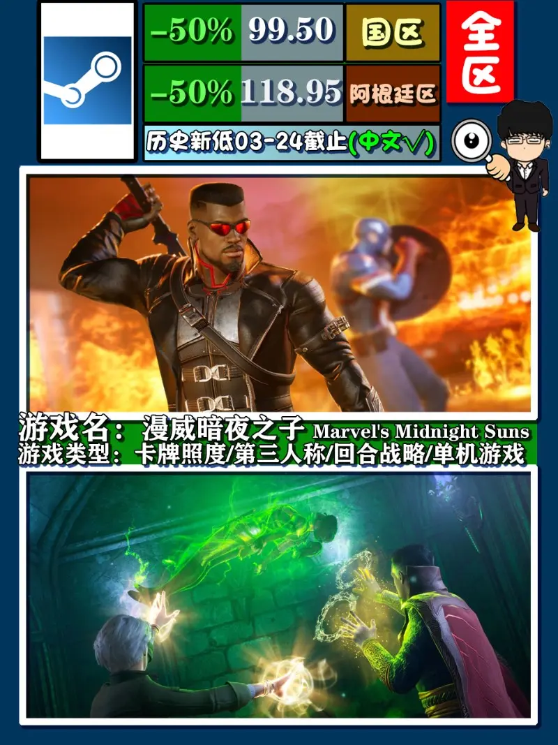 《漫威暗夜之子》,說實話遊戲未發售前想必很多玩家會誤認為這是款動作遊戲,卻萬萬沒想到是款卡牌遊戲,對於漫威粉來說這是一款不錯的入手遊戲,對於卡牌遊戲愛好者來說,前期也算值得考慮,加上全中文配音,雖然聽著有一股子譯製片的味道,但好歹有了更多帶入感,另外戰棋上的體驗也尤為新鮮,如果不在意後期重複度太高的設定,老基德還是比較推薦這款遊戲的