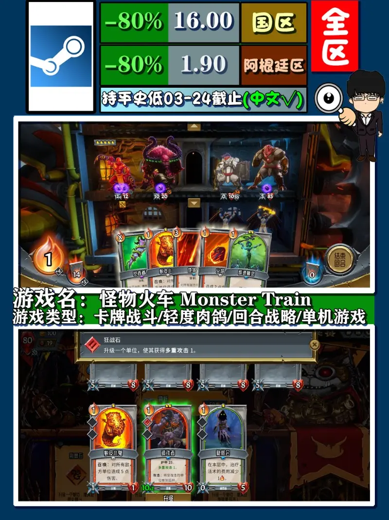 《怪物火車》,流程足夠短,玩後有好感,與上款遊戲截然不同的體驗,不過這也給這款遊戲在遊玩的過程中體驗不到拖延時間,這些感受都藏在了隨機系統當中,就像打牌一樣,順風之時要什麼有什麼,逆風之時打什麼悔什麼,加上車廂層級關係的設定,讓原本專注的戰鬥變得更為多方面,同時這也讓這款遊戲更適合於多周目的遊玩,如果想全方位的體驗,老基德個人推薦多玩上幾遍