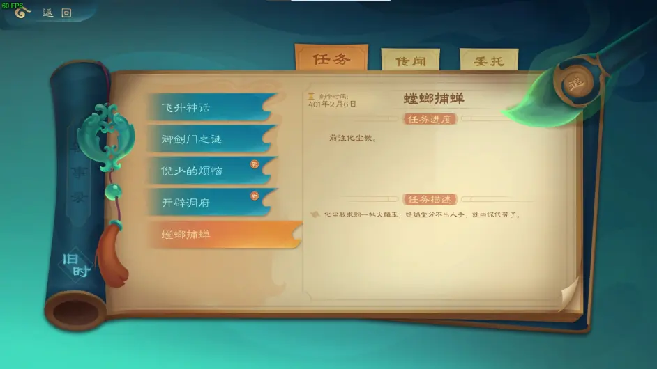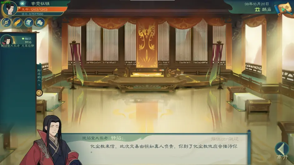 去宗門大廳跟掌門對話後在離火門觸發,麒麟的離火門大長老鍾焰會叫你去送趟快遞給化塵教。這裡鍾焰會送個上品靈寶火劍(3回合冷卻108火傷)。
