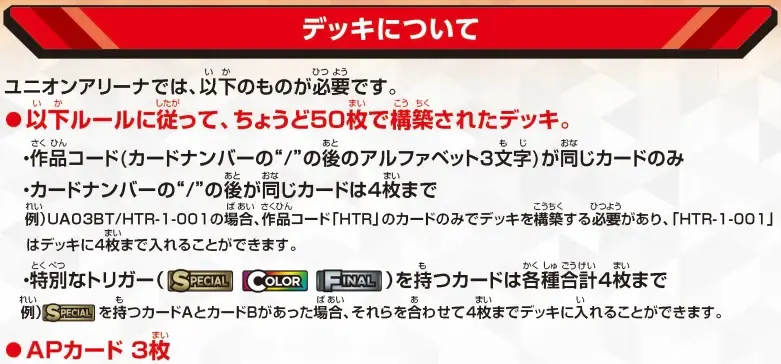 ·各類最多4張擁有特別的觸發(特殊觸發(Special Trigger,後稱ST),顏色觸發(Color Trigger,後稱CT),最終觸發(Final Trigger,後稱FT))的卡片