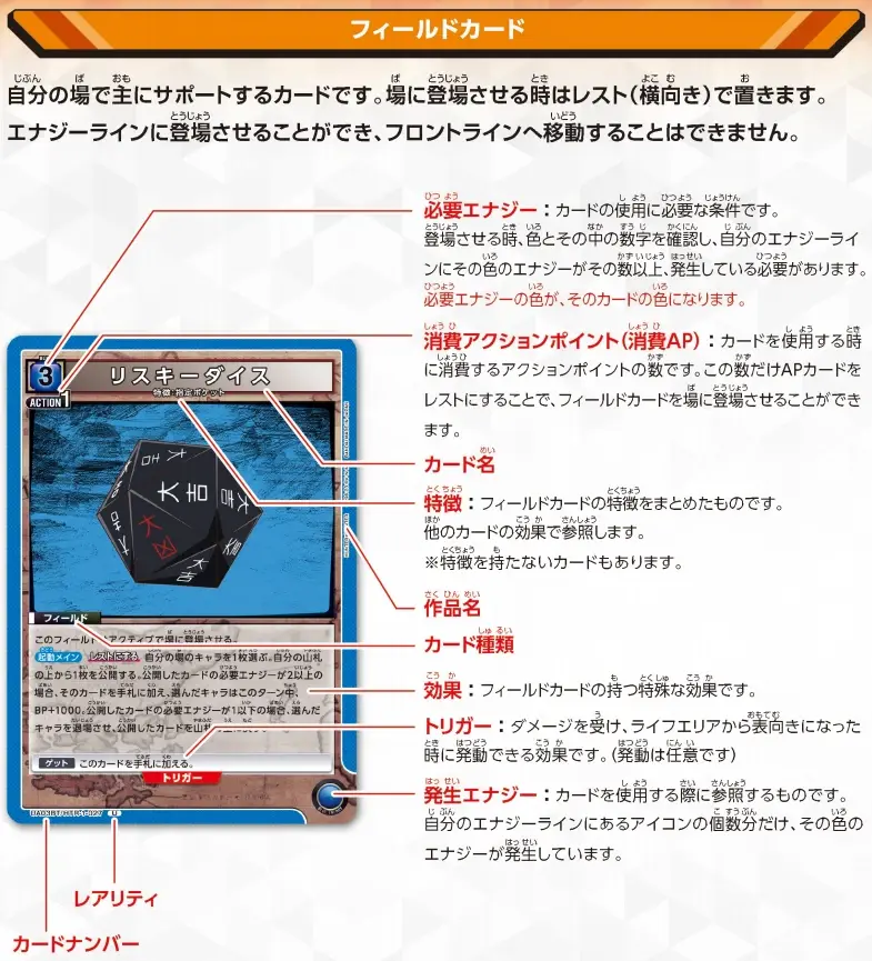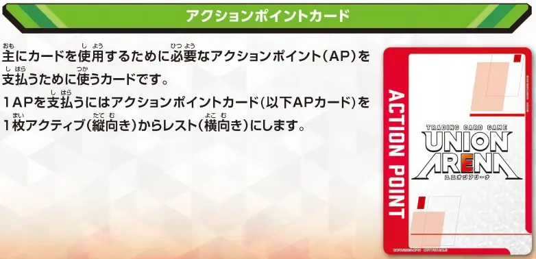 消費行動點數(Action Point,後稱為AP):使用卡片所需要消費的行動點數。可以將那個數值的AP卡橫置來登場場地卡。