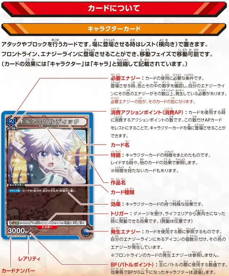 關於卡片——角色卡可以用於攻擊和阻擋的卡片。需要橫置進場。可以登場在前衛線(Front Line,後稱為FL)與能量線(Energy Line,後稱為EL),並在移動階段進行移動。