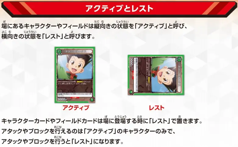 場上縱向的角色和場地卡的狀態被稱為啟用狀態。