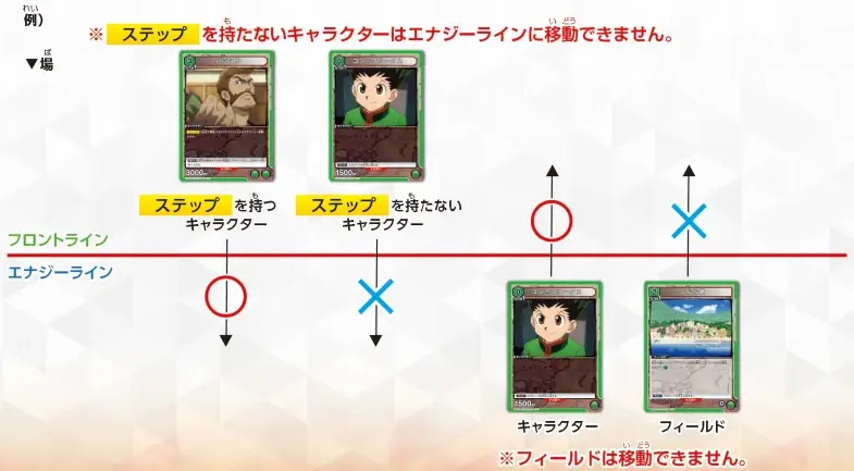 即使要把卡移動到已經有4張卡的區域的場合,你可以將擁有後撤(Step)效果的角色可以從FL同時移動到EL,使得FL與EL的角色位置互換,使自己可以不用將多餘卡放置到除外區。