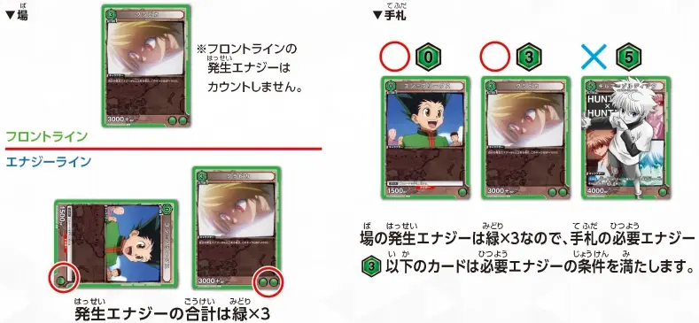 所需能量:使用卡片所必須的條件。登場時,需要確認顏色中的數字,自己的EL需要提供那個數值之上該顏色的能量。所需能量的顏色為那張卡的顏色。