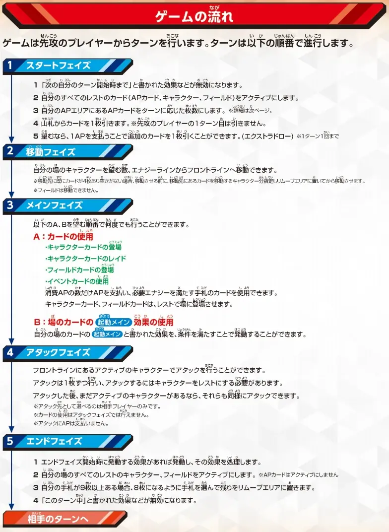 遊戲流程遊戲從先攻玩家開始執行回合。以以下的順序進行回合。