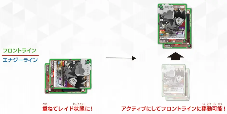 激躍角色卡擁有激躍效果的角色卡登場時,可以在沒有本身不擁有激躍效果的指定的角色上面疊放來激躍。指定的角色會寫在激躍圖示的右邊。