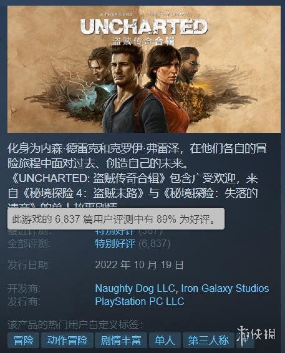 《神祕海域:盜賊傳奇合輯》獨佔登陸了PS5平臺,作為一款專門針對次世代主機推出的遊戲,畫面的效果又有了一定的提升。值得一提的是,該作也在去年10月登陸了Steam,遊戲目前在Steam上總評價為「特別好評」,好評率達到了89%。