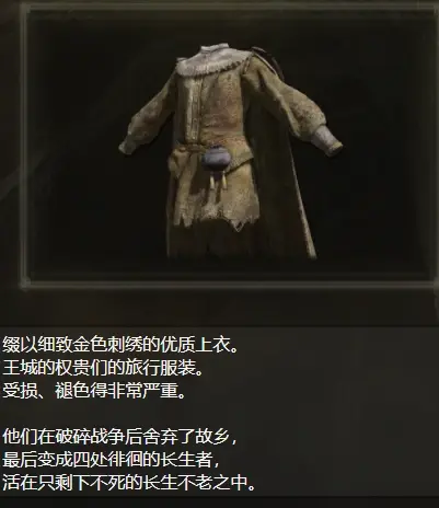 權貴XX系列裝備的前三行都會說明是“金色裝飾”、“王城的權貴”,後三行基本一致,表明這些雜魚在交界地曾經有著顯著的地位,是王城的權貴。這個王城當然是羅德爾,因為有很多權貴跪在緊閉的大門前。