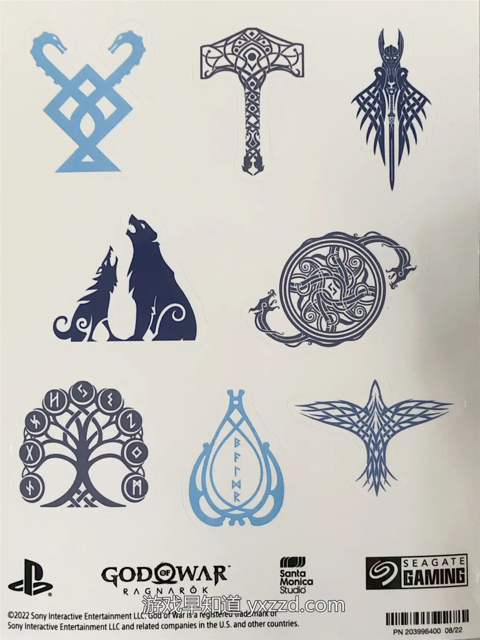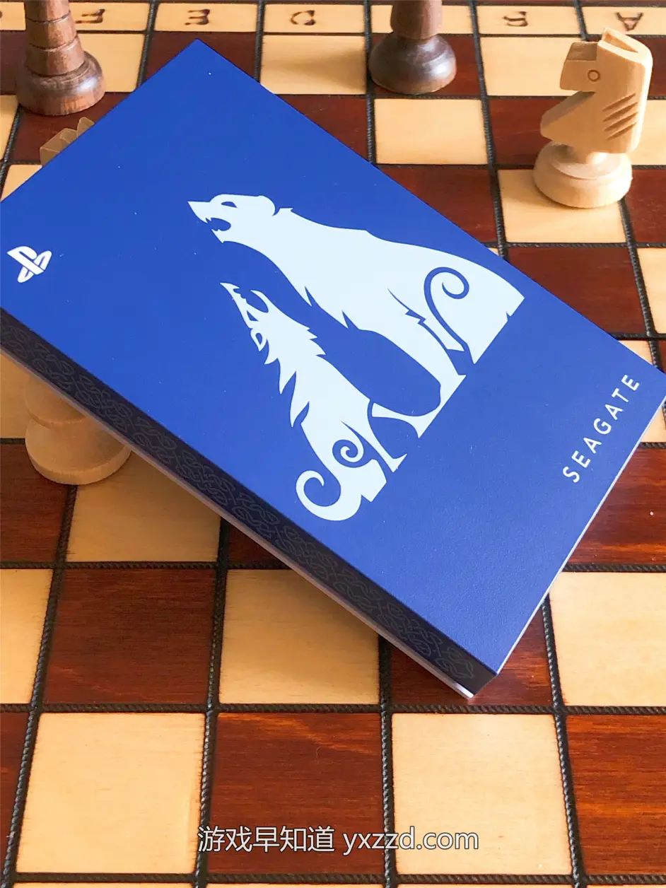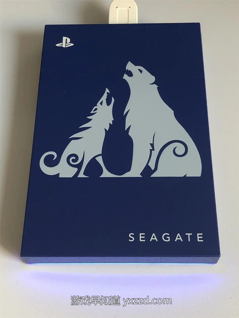 硬碟外殼為冷冽藍色,正面印有招牌的白色熊狼徽記,熟悉《戰神:諸神黃昏》的玩家一眼就能看出它代表著奎託斯與阿特柔斯父子,熊對應奎託斯,而狼對應阿特柔斯更確切的講是洛基。熊狼徽記的設計簡潔大氣、完美契合遊戲的主旨、辨識度極高。硬碟正面左上角有白色的“PlayStation”標誌logo,右下角有白色的“Seagate”字樣logo。背面為白色,中間印有冷冽藍色的《戰神:諸神黃昏》英文“God of War Ragnarök”藝術字Logo,與外殼配色相得益彰。硬碟側面則是冷冽藍背景搭配白色的北歐風紋樣。此外硬碟底部有RGB LED燈效,預設燈光為淺色的湖藍色,與整體的冷冽藍色搭配協調。PC上還支援通過Seagate Toolkit自定義設定RGB燈光顏色、呼吸狀態。遊戲外包裝也是《戰神:諸神黃昏》主題特別版包裝,同時隨硬碟還附送有一張《戰神:諸神黃昏》的主題貼紙,包括招牌的雷神戰錘和女武神形象。《戰神:諸神黃昏》特別版遊戲硬碟的設計非常用心,讓這款硬碟兼具了藝術性和收藏性,如果大家是《戰神》粉絲,那麼看到這款硬碟的第一時間就會愛不釋手。