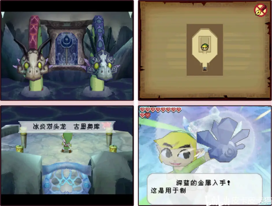 BOSS戰:對戰冰炎雙頭龍古里奧庫,利用繩索反彈對應的火球和冰球,跳上杆子躲避衝浪,用繩索固定龍頭一頓暴打,終於擊殺了BOSS,入手深藍的金屬。
