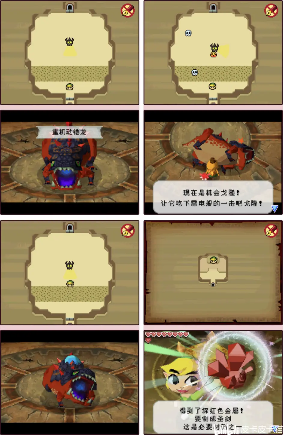 Link過橋後,本以為已經死掉的龍活過來了,背上還長出一顆藍色的珠子,繼續戰鬥。戰鬥結束得到深紅色金屬。