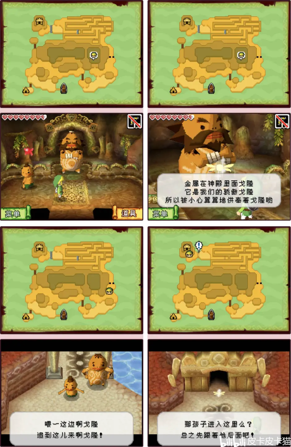 進入神殿,沙地是不可以進入的。主要以推箱子謎題和戰鬥為主,救出麥戈隆後,就可以切換小孩麥戈隆和Link兩人分別活動了。兩個人同時踩上機關,得到道具老鼠炸彈。